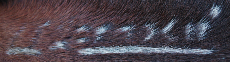 Es ist ein Kaltbrand, der durch die extreme Kälte die Zellen in der Haut des Tieres abtötetet. Dass wiederum sorgt für eine weiße Pigmentierung, d.h. die Haare in diesem Bereich werden nach ca. 3 Monaten weiß nachwachsen.